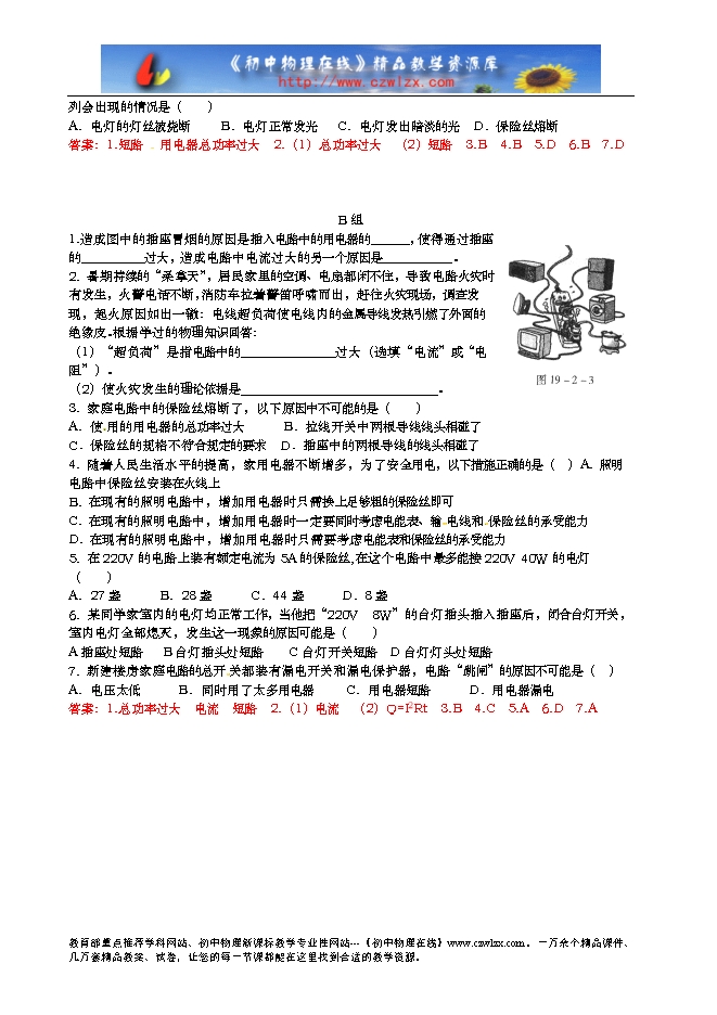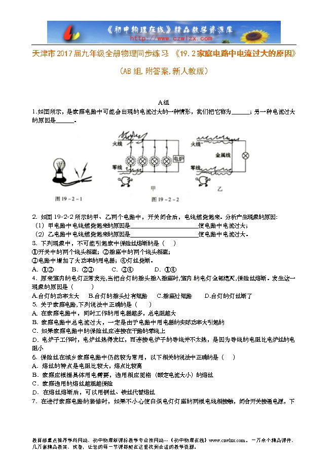 天津市2017届九年级全册物理同步练习:《19.2家庭电路中电流过大的原因》(AB组,附答案,新人教版)