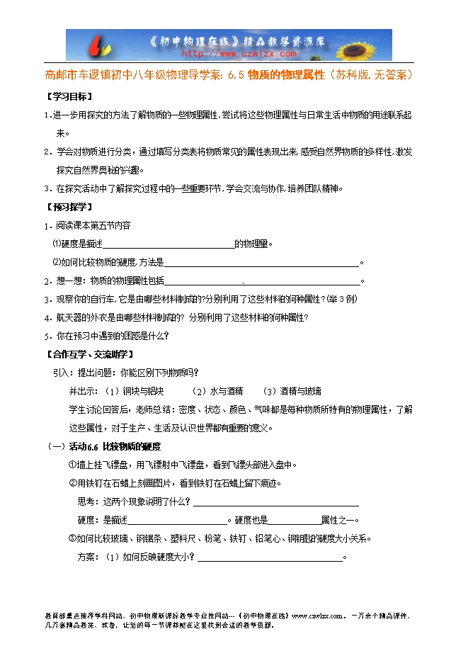 高邮市车逻镇初中八年级物理导学案:6.5物质的物理属性(苏科版,无答案)