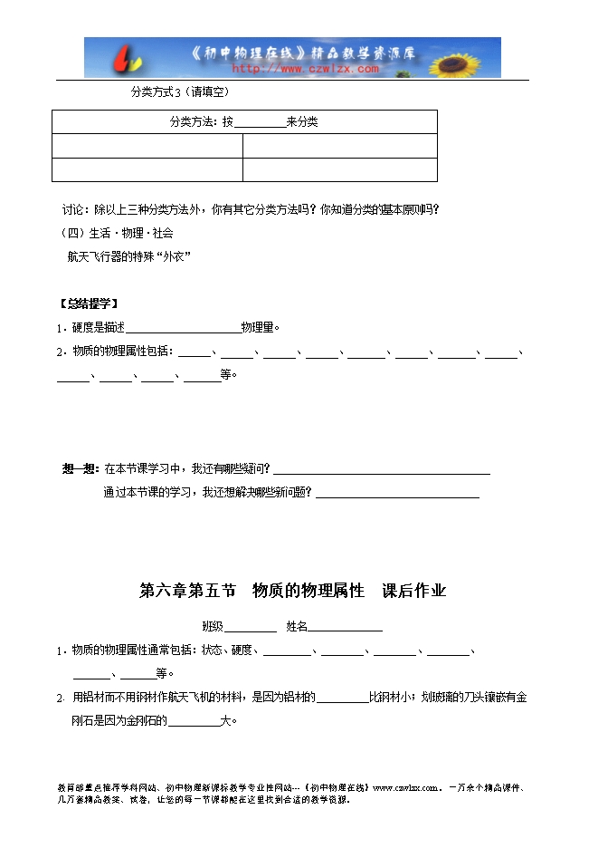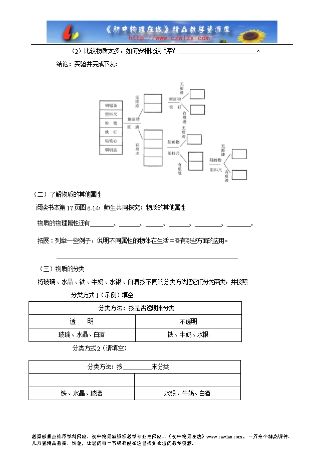 1.进一步用探究的方法了解物质的一些物理属性,尝试将这些物理属性与日常生活中物质的用途联系起来。