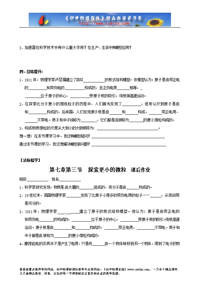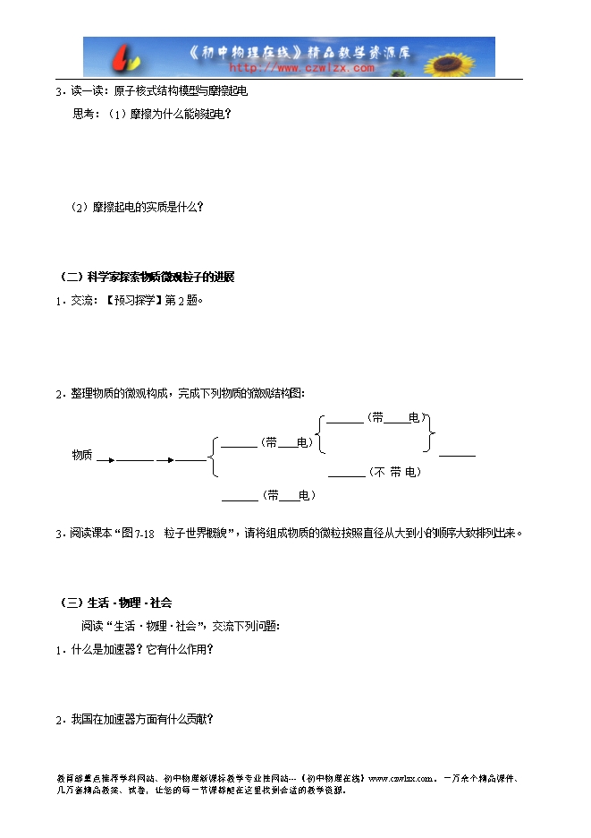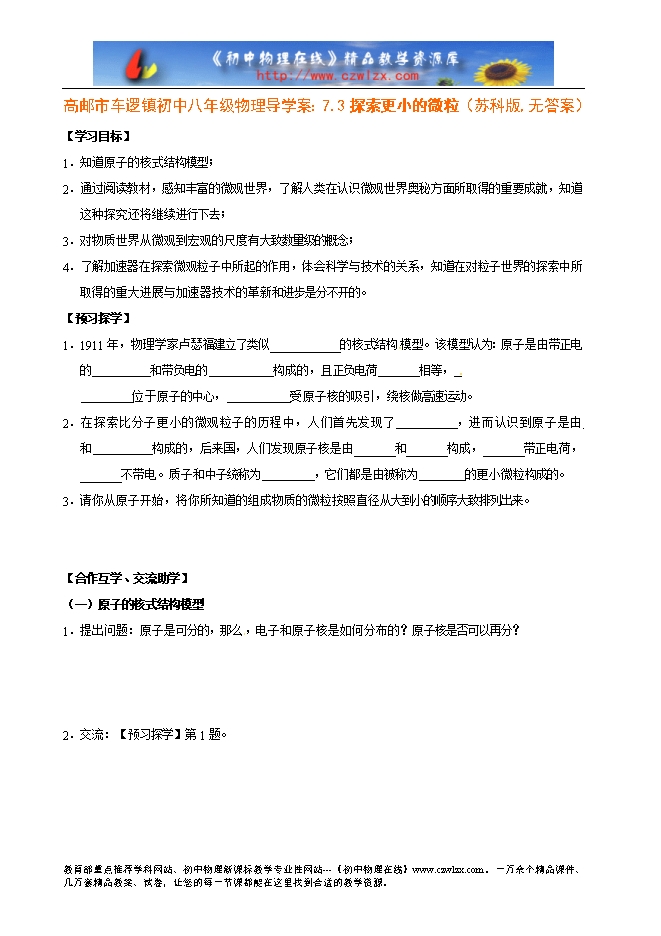 高邮市车逻镇初中八年级物理导学案:7.3探索更小的微粒(苏科版,无答案)