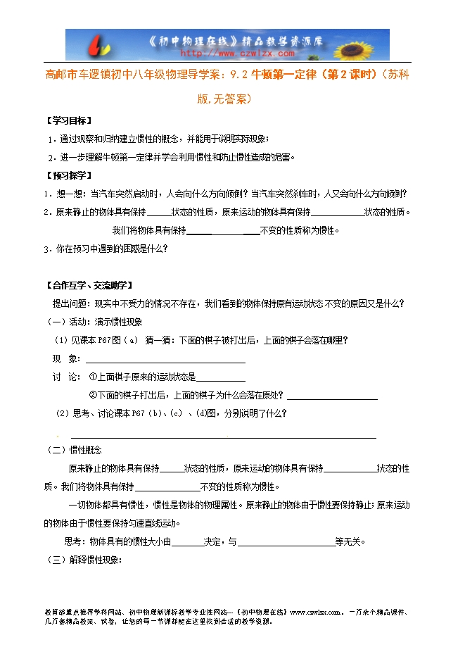 高邮市车逻镇初中八年级物理导学案:9.2牛顿第一定律(第2课时)(苏科版,无答案)