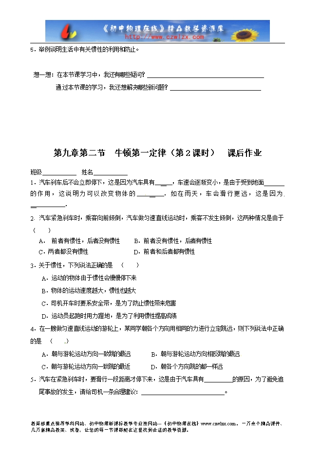 1.想一想:当汽车突然启动时,人会向什么方向倾倒?当汽车突然刹车时,人又会向什么方向倾倒?