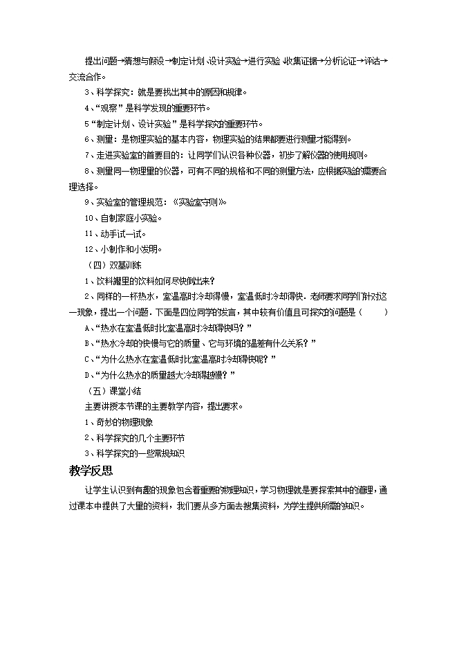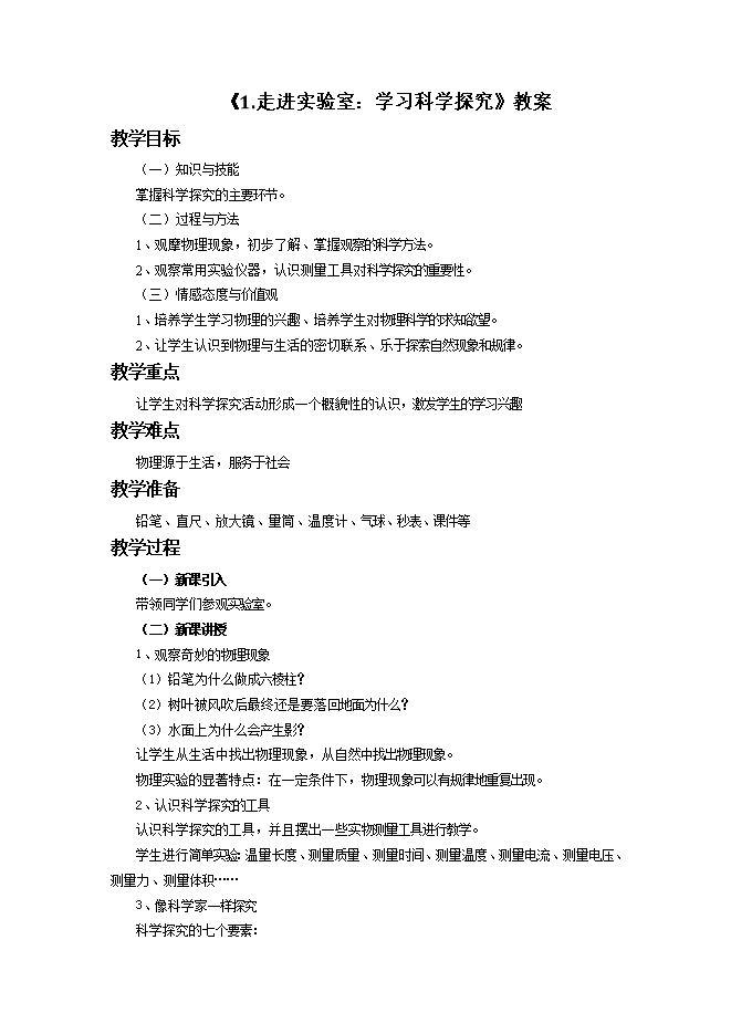 教科版八年级物理《1.1走进实验室:学习科学探究》教案