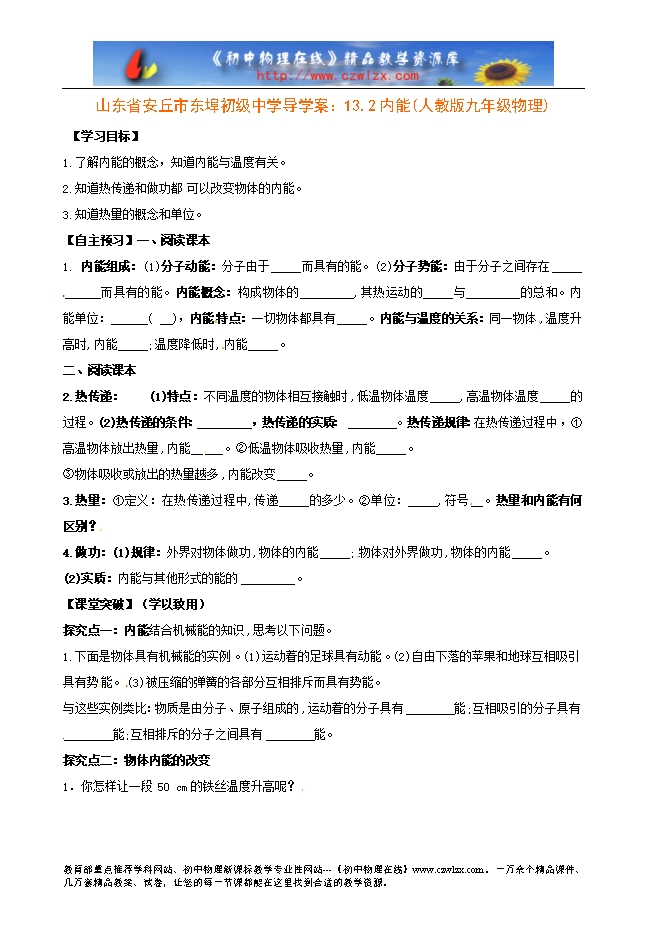 山东省安丘市东埠初级中学导学案:13.2内能(人教版九年级物理)