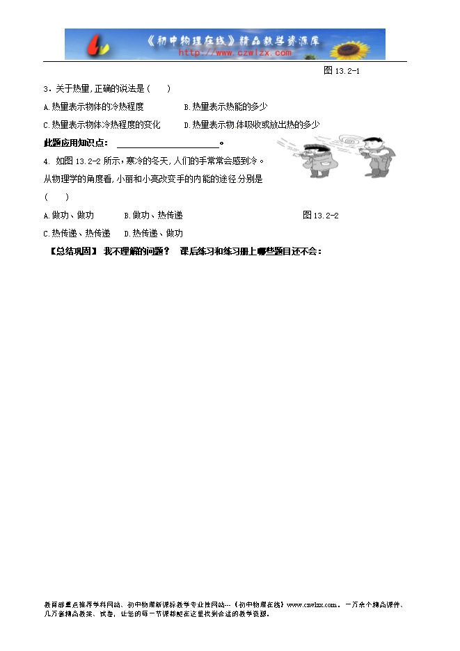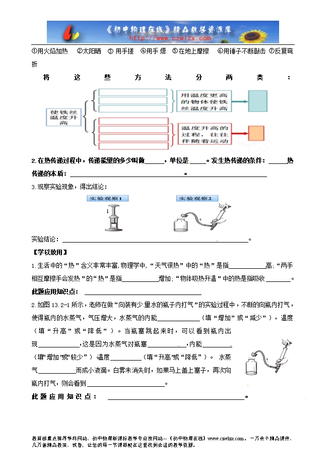 2.热传递:[来](1)特点:不同温度的物体相互接触时,低温物体温度_____,高温物体温度_____的过程。(2)热传递的条件: ,热传递的实质: 。热传递规律:在热传递过程中,①高温物体放出热量,内能__ ___。②低温物体吸收热量,内能_____。