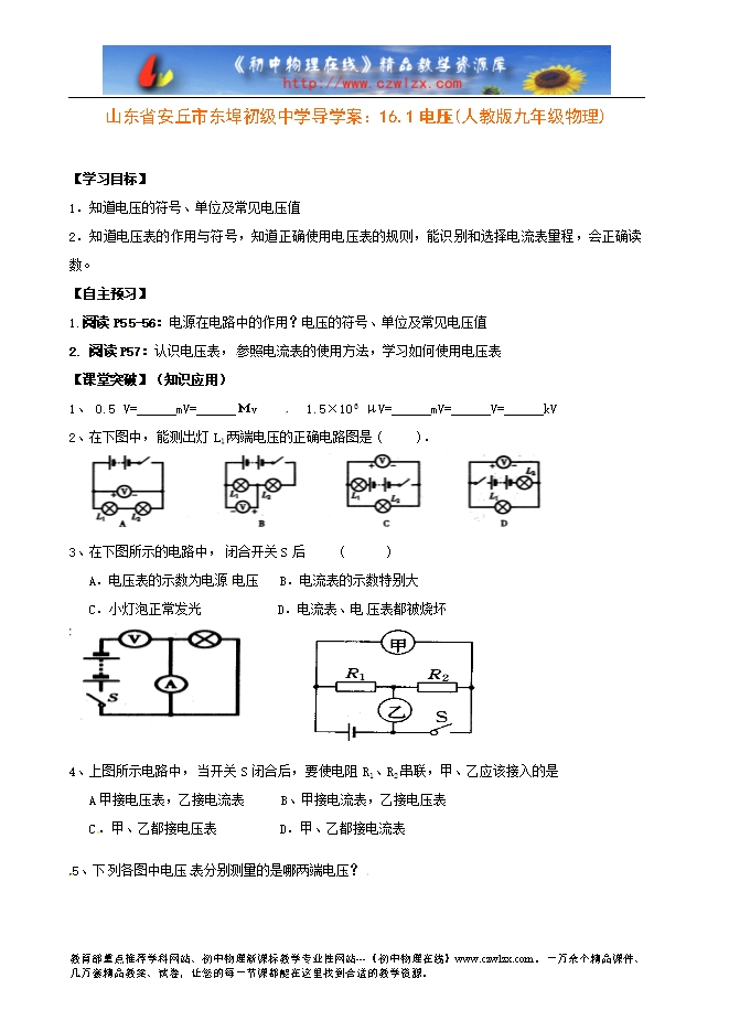山东省安丘市东埠初级中学导学案:16.1电压(人教版九年级物理)