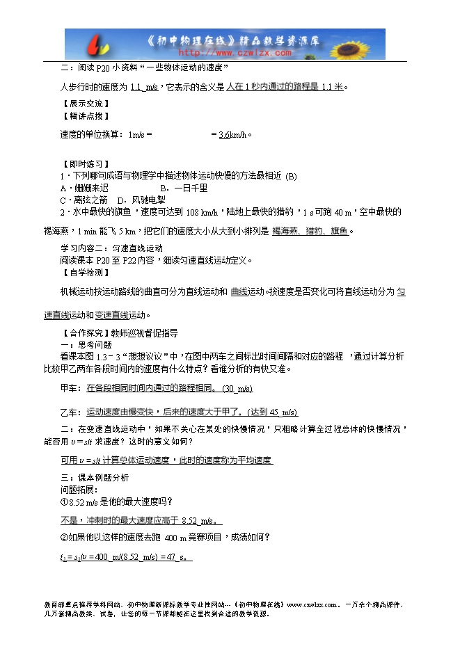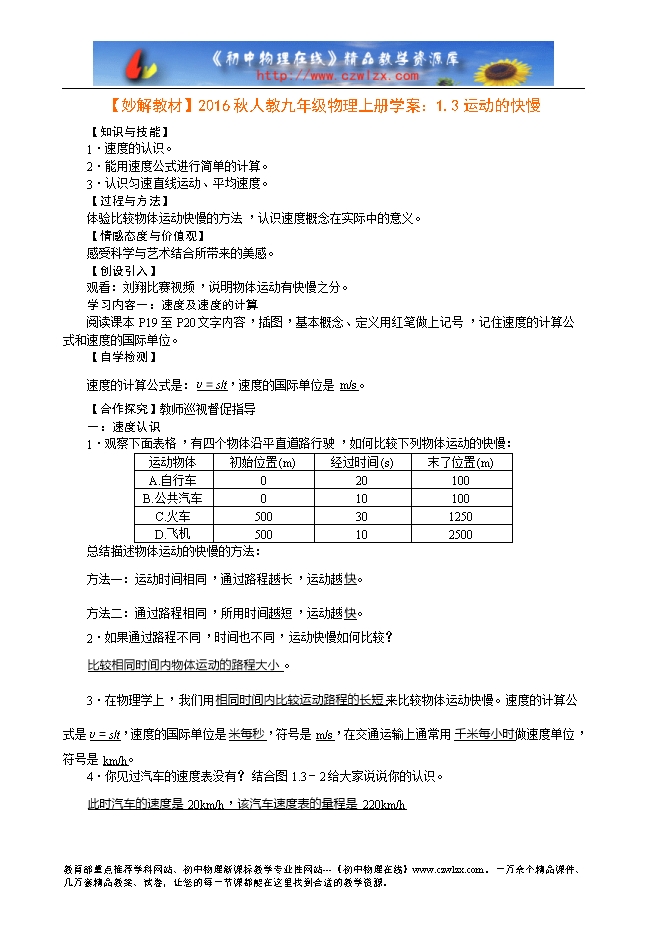 【妙解教材】2016秋人教九年级物理上册学案:1.3运动的快慢