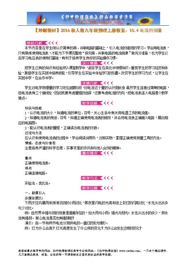 【妙解教材】2016秋人教九年级物理上册教案:15.4电流的测量