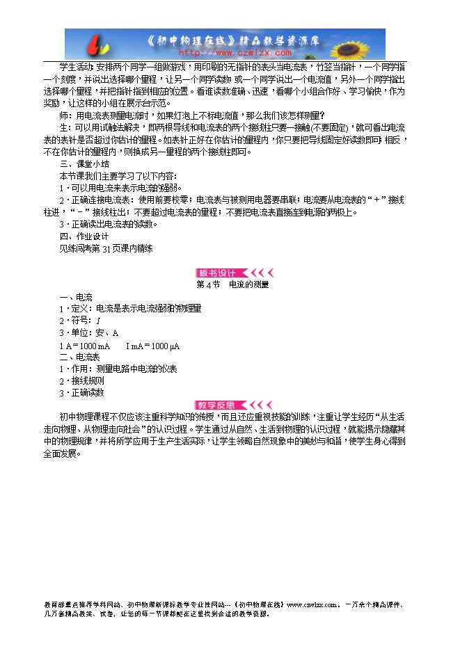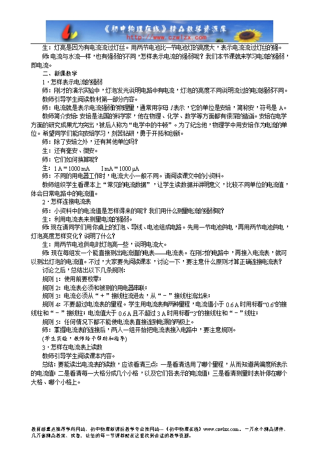 【内容简介】本节内容是在学生刚认识简单的串、并联电路的基础上,引入电流的强弱的学习。学会用电流表,只有熟练使用电流表,才能为下节课完整地“探究串、并联电路的电流规律”做充分准备,也为学生以后学习电压表的使用打基础,有利于培养学生良好的实验操作习惯。