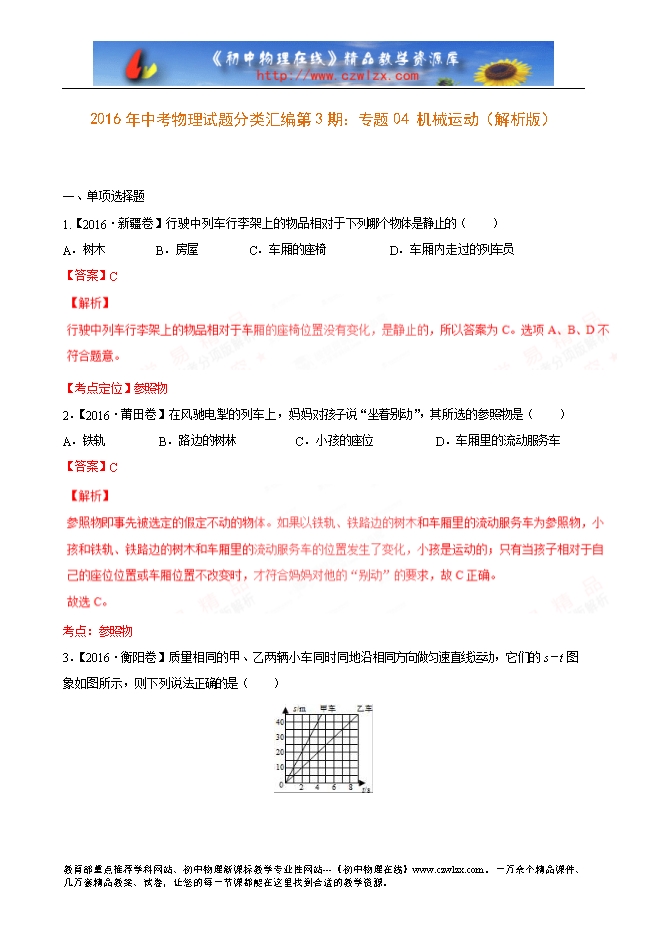 1.【2016?新疆卷】行驶中列车行李架上的物品相对于下列哪个物体是静止的( )