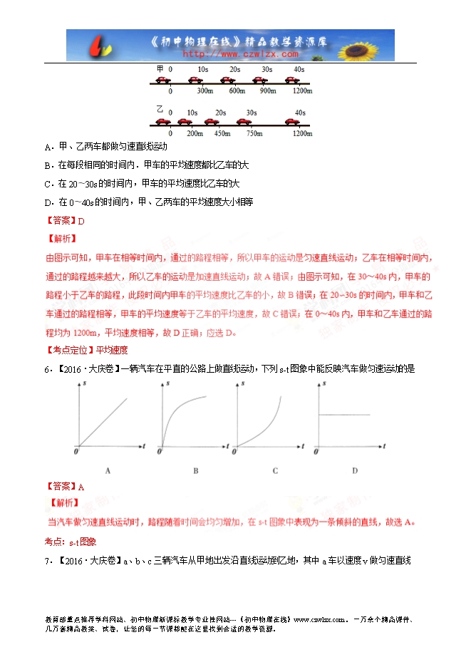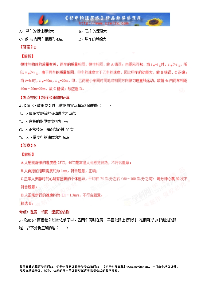 3.【2016?衡阳卷】质量相同的甲、乙两辆小车同时同地沿相同方向做匀速直线运动,它们的s﹣t图象如图所示,则下列说法正确的是( )