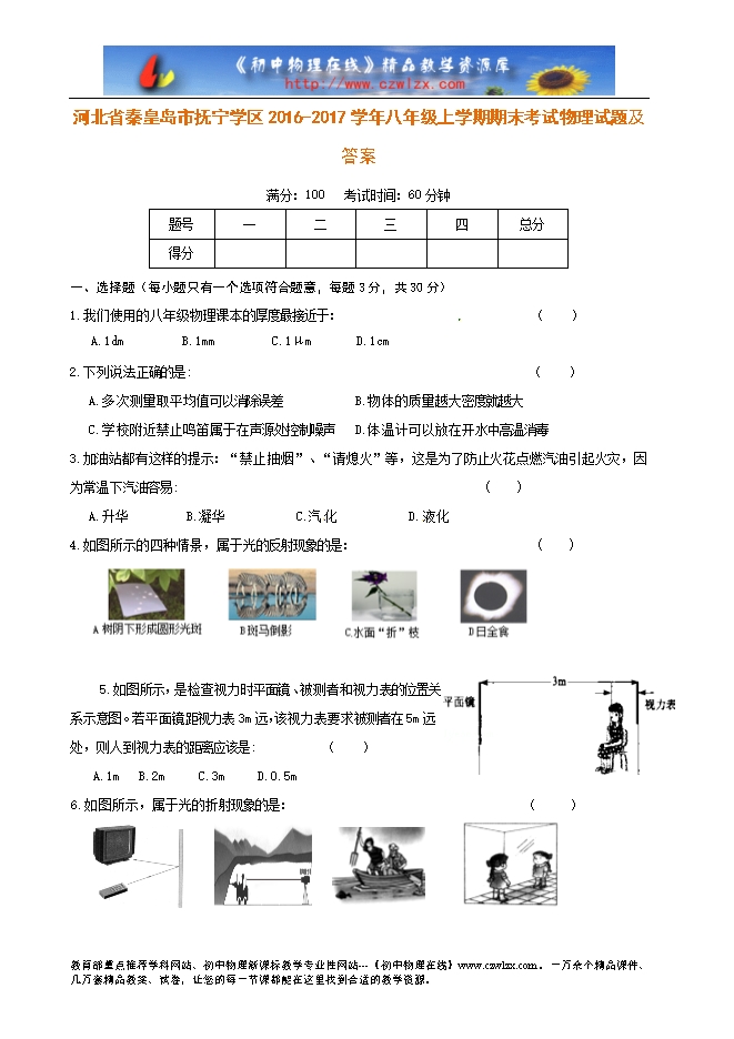 河北省秦皇岛市抚宁学区2016-2017学年八年级上学期期末考试物理试题及答案