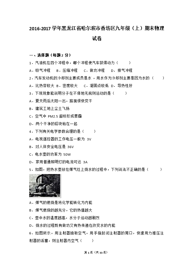 黑龙江省哈尔滨市香坊区2017届九年级(上)期末物理试卷(解析版)