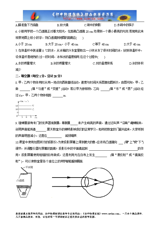 6. 小丽同学把一个凸透镜正对着太阳光,在距离凸透镜20 cm处得到一个最小最亮的光斑.若她用此来观察地图上较小的字,则凸透镜到地图的距离应( )