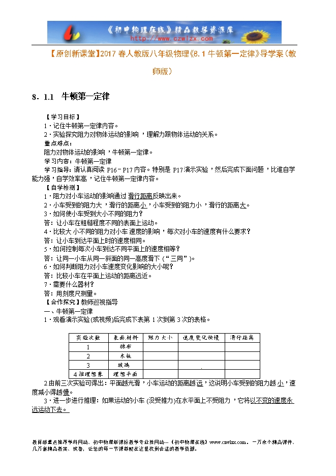 【原创新课堂】2017春人教版八年级物理《8.1牛顿第一定律》导学案(教师版)