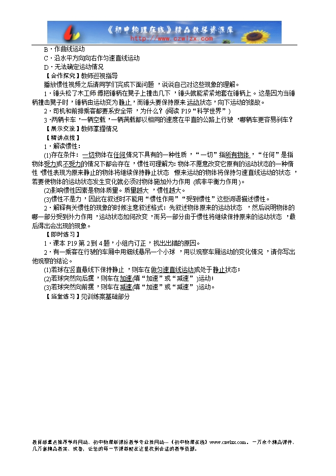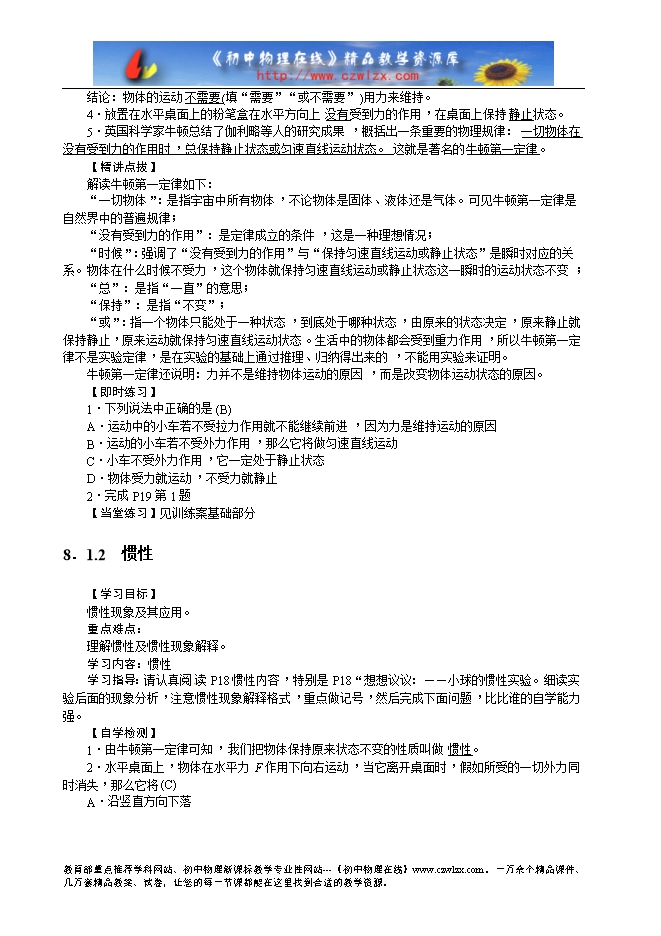 学习指导:请认真阅读P16-P17内容。特别是P17演示实验,然后完成下面问题,比谁自学能力强,自学效率高,记住牛顿第一定律内容。