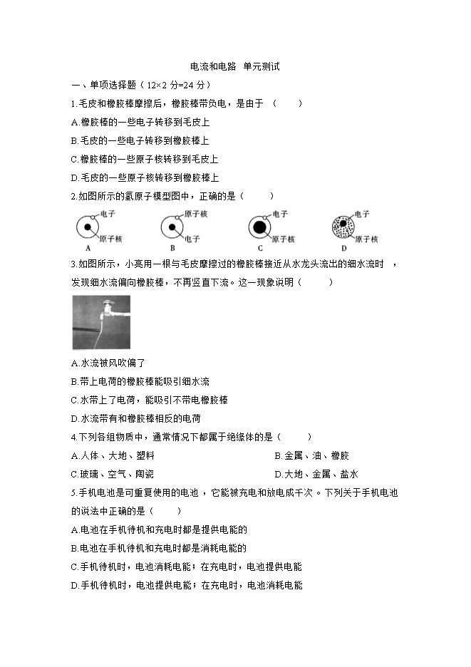 3.如图所示,小亮用一根与毛皮摩擦过的橡胶棒接近从水龙头流出的细水流时,发现细水流偏向橡胶棒,不再竖直下流。这一现象说明( )
