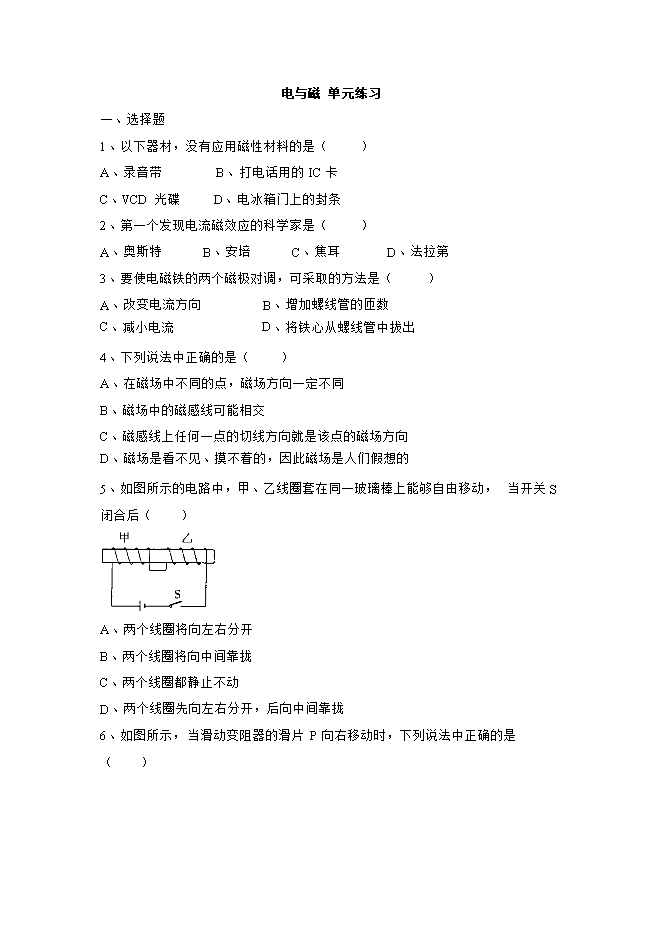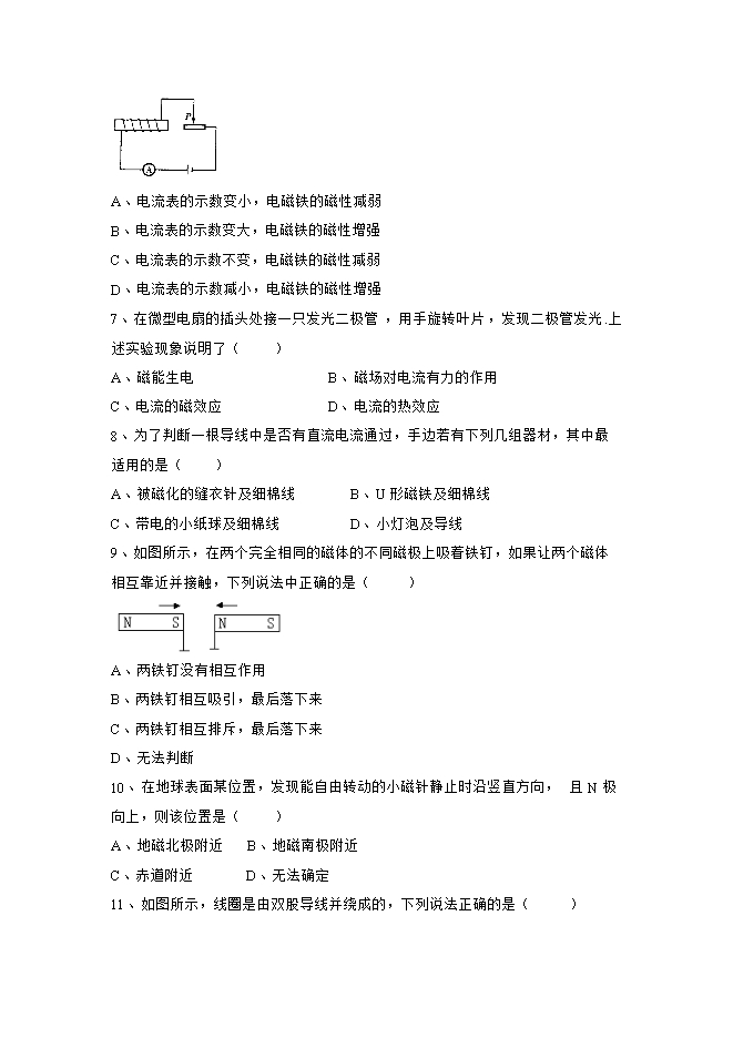 6、如图所示,当滑动变阻器的滑片P向右移动时,下列说法中正确的是( )