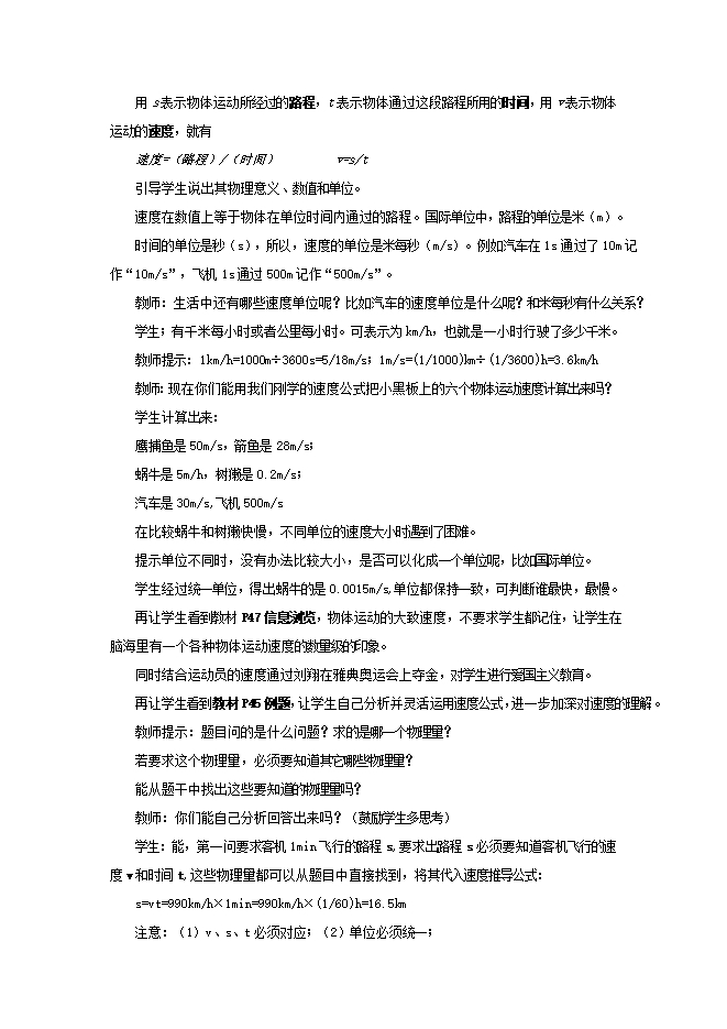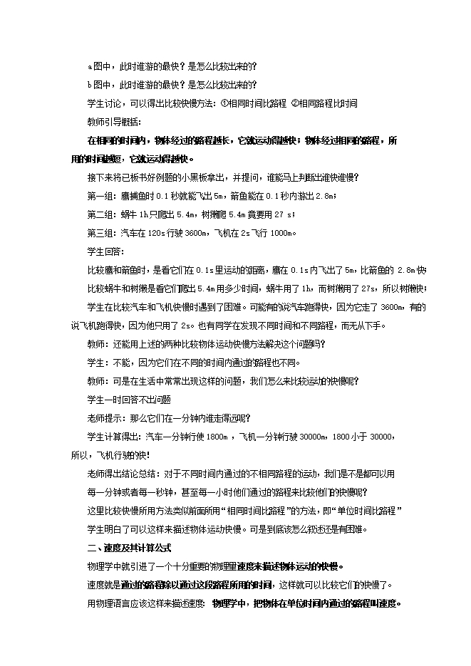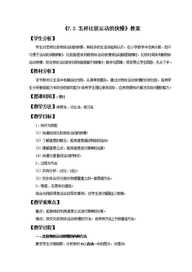 本节教材以生活中机械运动为例,从简单到复杂,通过对物体运动快慢的分析比较,培养学生分析概括能力和初步的探究能力;培养学生理论联系实际、应用物理知识解决实际问题的能力。