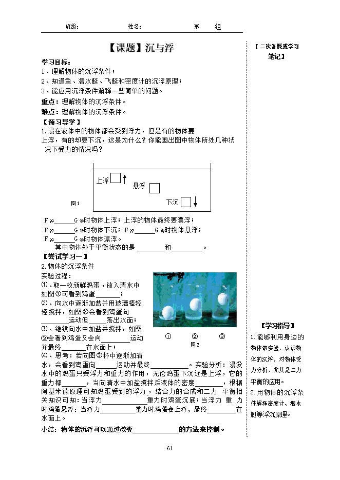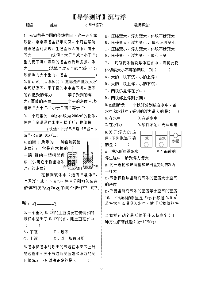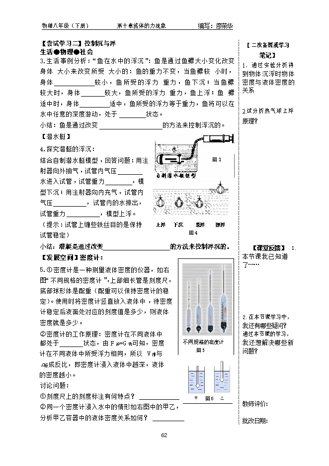 2、知道鱼、潜水艇、飞艇和密度计的沉浮原理;