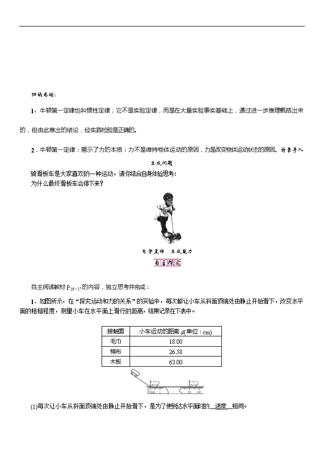 2.牛顿第一定律:揭示了力的本质:力不是维持物体运动的原因,力是改变物体运动状态的原因。情景导入 生成问题