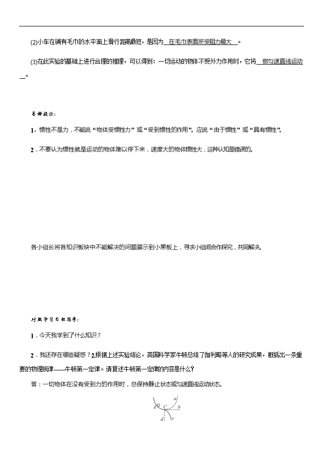 1.牛顿第一定律也叫惯性定律,它不是实验定律,而是在大量实验事实基础上,通过进一步推理概括出来的,但由此推出的结论,经实践检验是正确的。
