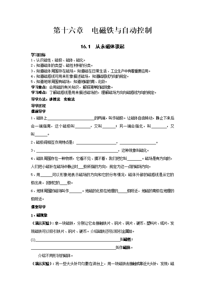 2017年春九年级物理下册沪粤版精品学案:16.1从永磁体谈起(无答案)