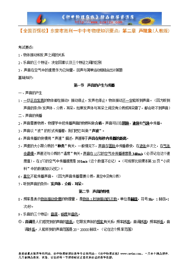 【全国百强校】东营市胜利一中中考物理知识要点:第二章 声现象(人教版)