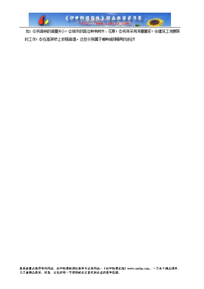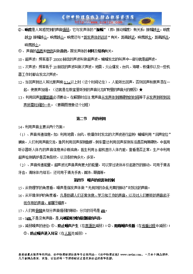 5、声速的大小跟介质的“种类”有关,一般情况下,声音在固体中传播最快,在液体中次之,在气体中最慢。声速还与介质的“温度”有关。声音在15℃的空气中传播速度是340m/s(必须记住这个速度值),在0℃的空气中传播速度是331m/s(这个数值不必记)。(可观察比较课本第30页“小资料”中的数据加以记忆);