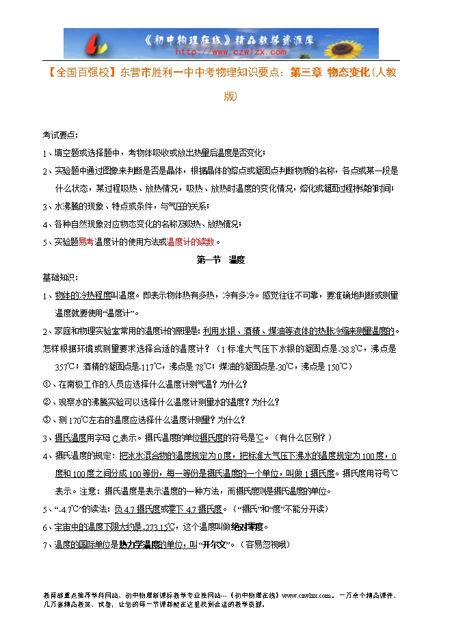 【全国百强校】东营市胜利一中中考物理知识要点:第三章 物态变化(人教版)