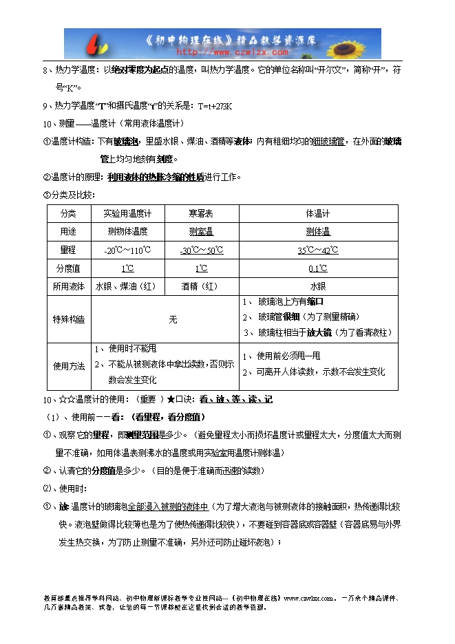 1、物体的冷热程度叫温度。即表示物体热有多热,冷有多冷。感觉往往不可靠,要准确地判断或测量温度就要使用“温度计”。