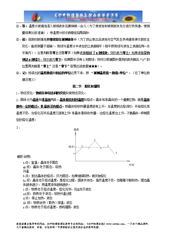 2、实验题中通过图象来判断是否是晶体,根据晶体的熔点或凝固点判断物质的名称,各点或某一段是什么状态,某过程吸热、放热情况,吸热、放热时温度的变化情况,熔化或凝固过程持续的时间;