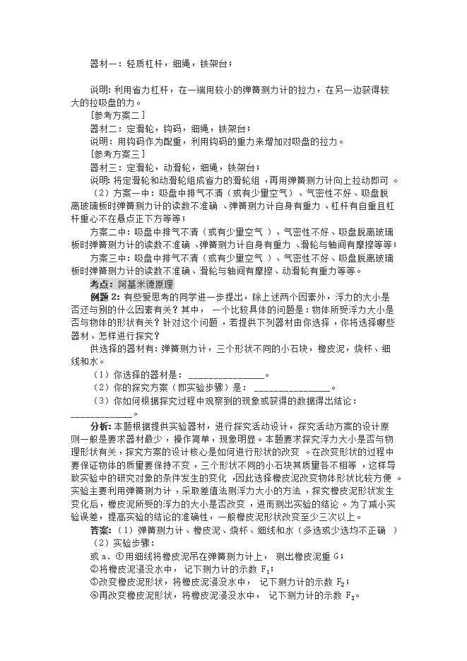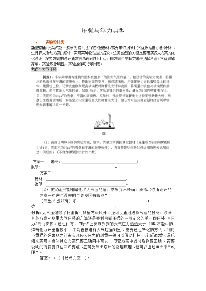 分析:大气压强除了托里拆利测量方法以外,还可以通过选择合理的器材,设计其他方案。测量大气压强的方法还是要利用到压强的一般定义入手,即压强=压力/受力面积。通过估算,75px2上皮碗受到的大气压力远远大于10N,本题中的弹簧测力计量程较小,不能直接进行大气压强测量,需要通过转化的方法,利用小量程的弹簧测力计来实现较大压力的测量一般可以借助杠杆、钩码配重、滑轮组来实现。当然其它方案只要正确同样可以,每套方案中器材选择要正确,简要说明的内容要抓住知识要点,正确反映出设计的物理原理,也可以通过画图来“说明”。