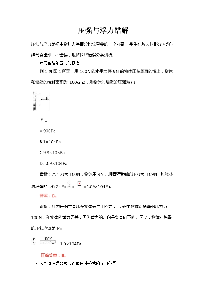 【内容简介】压强与浮力是初中物理力学部分比较重要的一个内容。学生在解决这部分习题时经常会出现一些错误,现将这些错误分类辨析。 一、未完全理解压力的概念