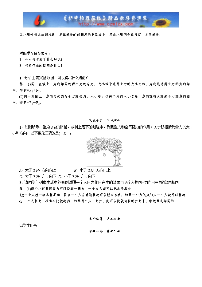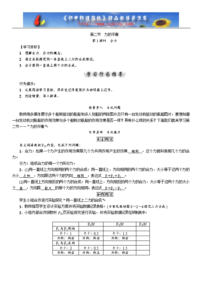 【名师测控】2017年春教科版八年级物理下册教学案:8.2力的平衡(第1课时 合力)(教师版)