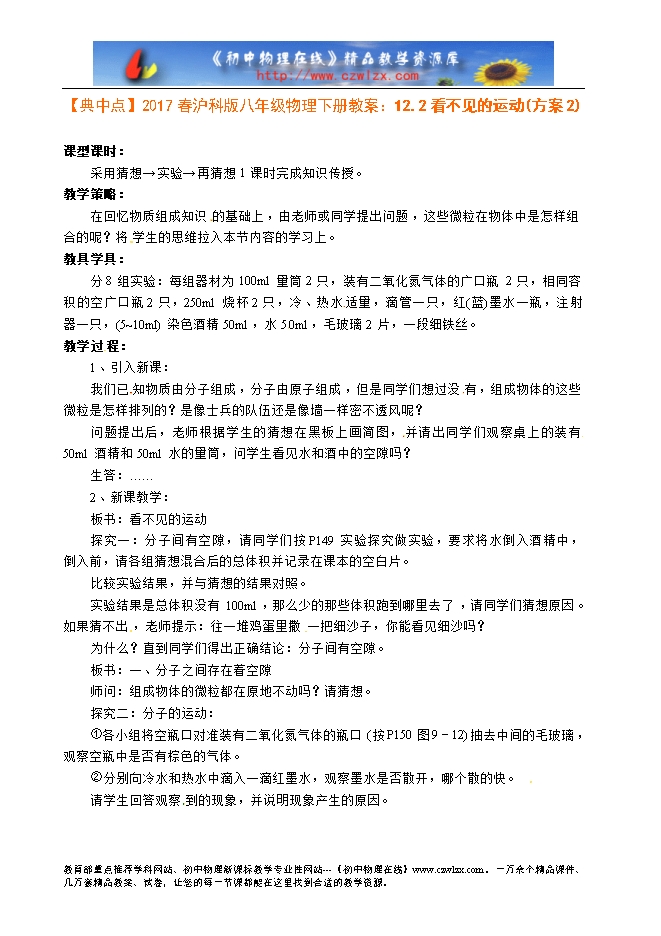 【典中点】2017春沪科版八年级物理下册教案:11.2看不见的运动(方案2)