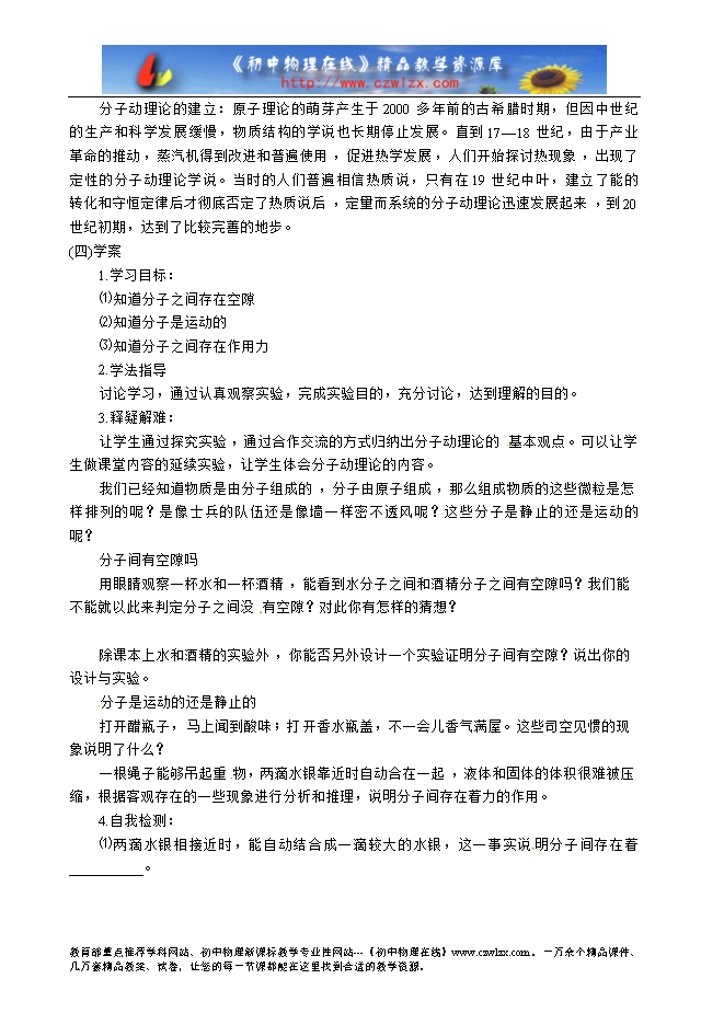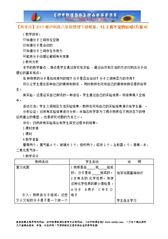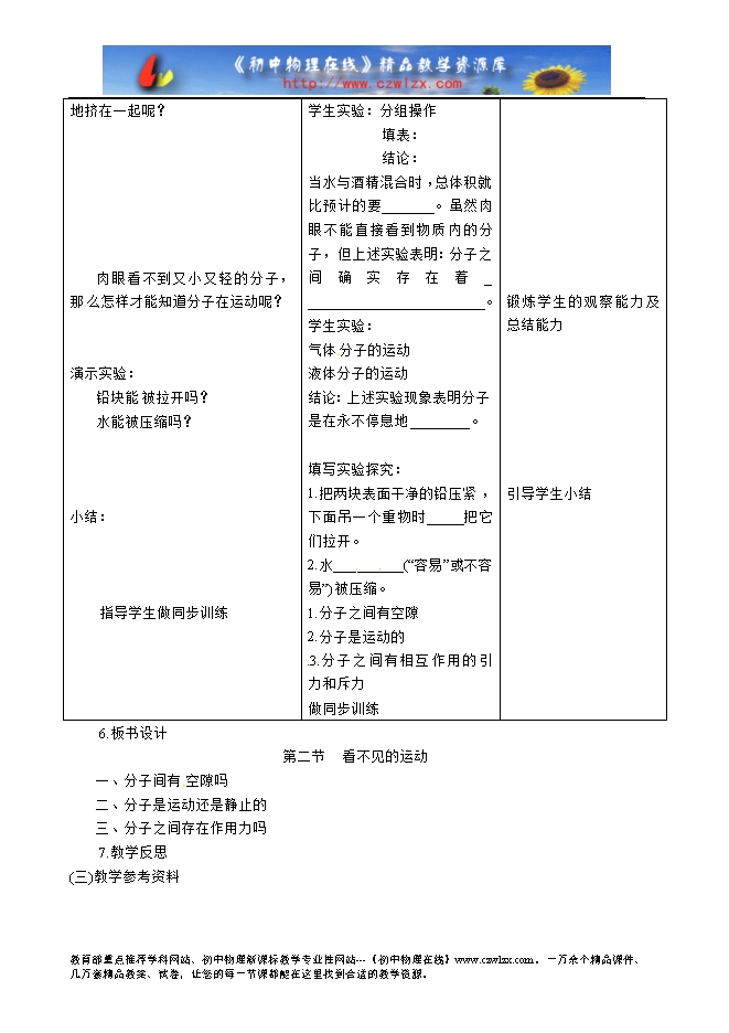 本节的教学重点、难点是学生通过探究性实验、通过合作和交流的方式归纳出分子动理论的基本观点。