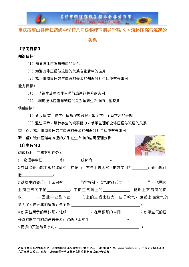 重庆市璧山县青杠初级中学校八年级物理下册导学案:9.4流体压强与流速的关系