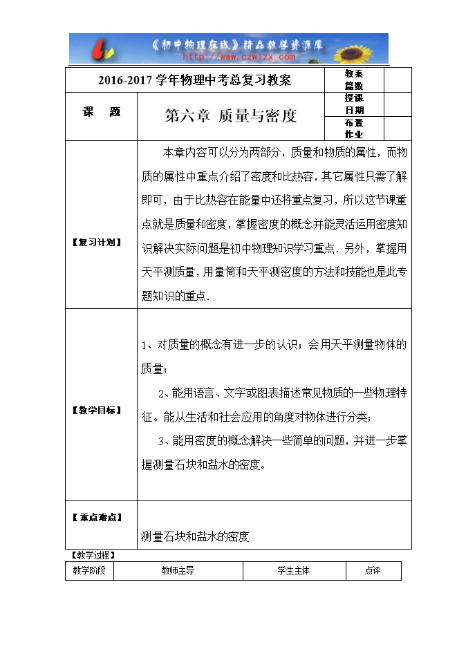 福建省南平市光泽县茶富中学2017届中考物理第一轮复习教案:第六章 质量与密度