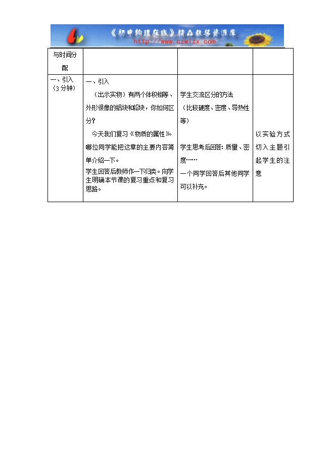 【内容简介】【复习计划】 本章内容可以分为两部分,质量和物质的属性,而物质的属性中重点介绍了密度和比热容,其它属性只需了解即可,由于比热容在能量中还将重点复习,所以这节课重点就是质量和密度,掌握密度的概念并能灵活运用密度知识解决实际问题是初中物理知识学习重点.另外,掌握用天平测质量,用量筒和天平测密度的方法和技能也是此专题知识的重点.