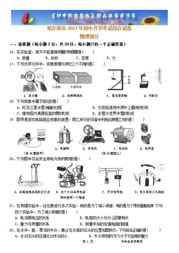 黑龙江省哈尔滨市2017年中考理综(物理部分)试题(word版,含答案)