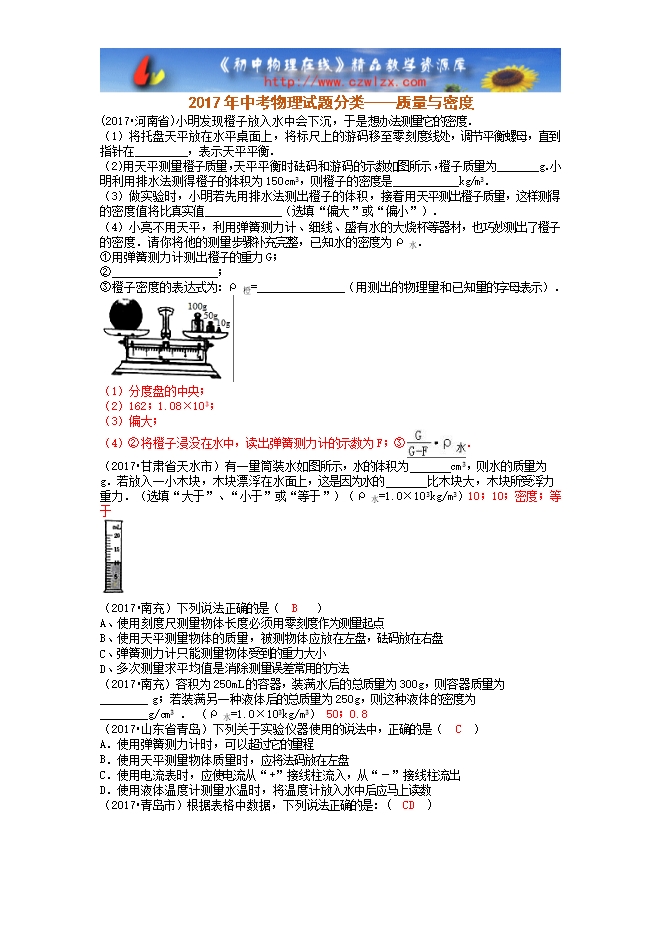 【内容简介】(2017?河南省)小明发现橙子放入水中会下沉,于是想办法测量它的密度.