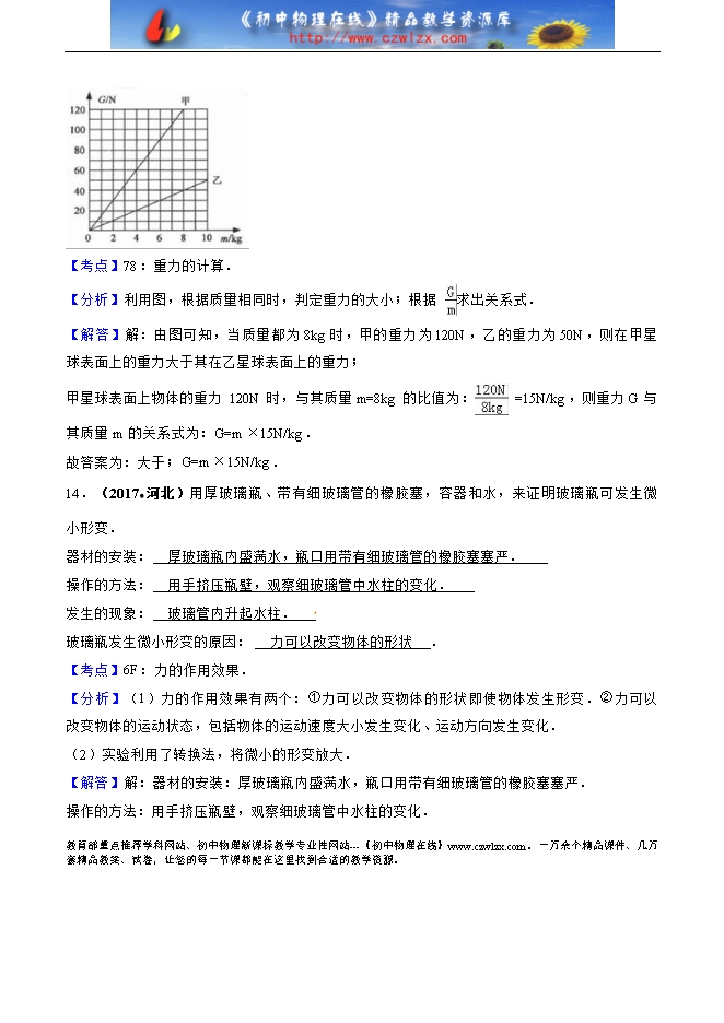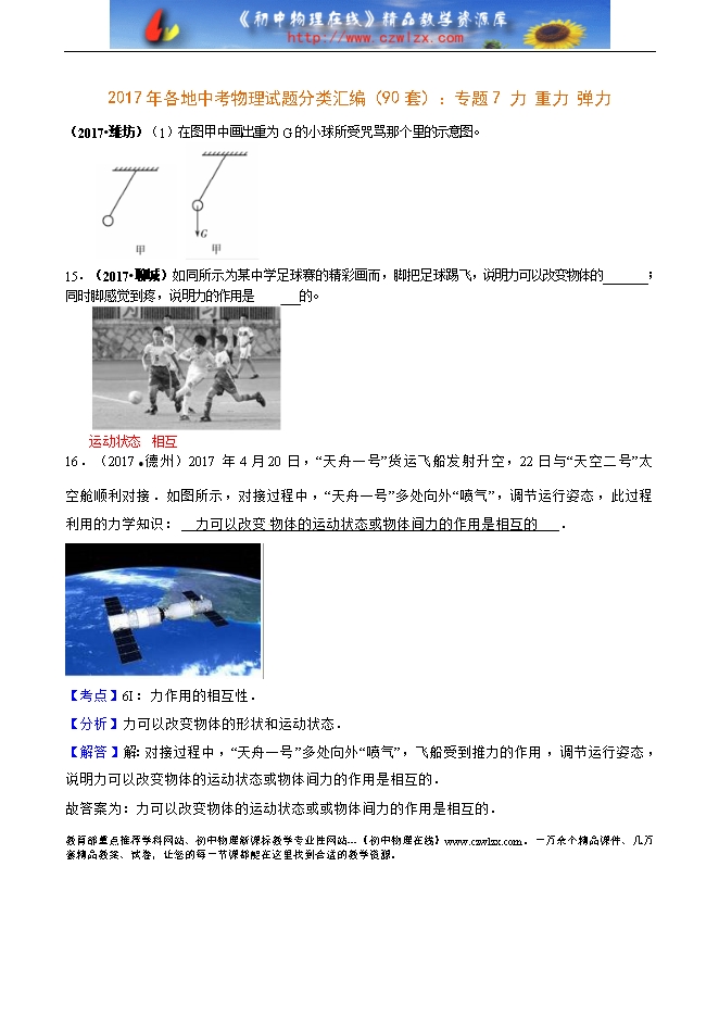 2017年各地中考物理试题分类汇编(90套):专题7 力 重力 弹力