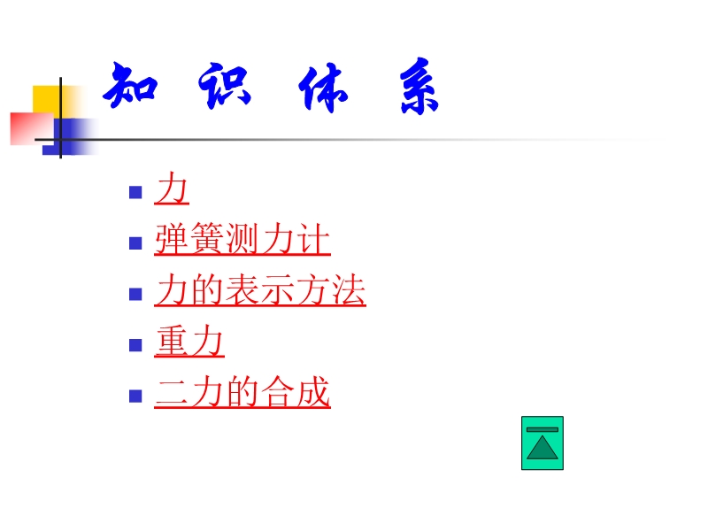 课件由知识体系、典型例题、练习三部分组成,知识体系详细地复习了力、弹簧测力计、力的表示方法、重力、二力的合成的各个重要知识点;典型例题选取了5道精典好题,并对每一道题进行详细的分析和解答;5道选择题练习既可以当堂检验学生的学习效果,又不会占用太多时间。