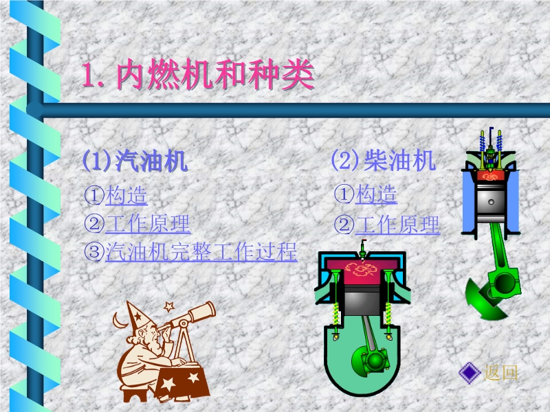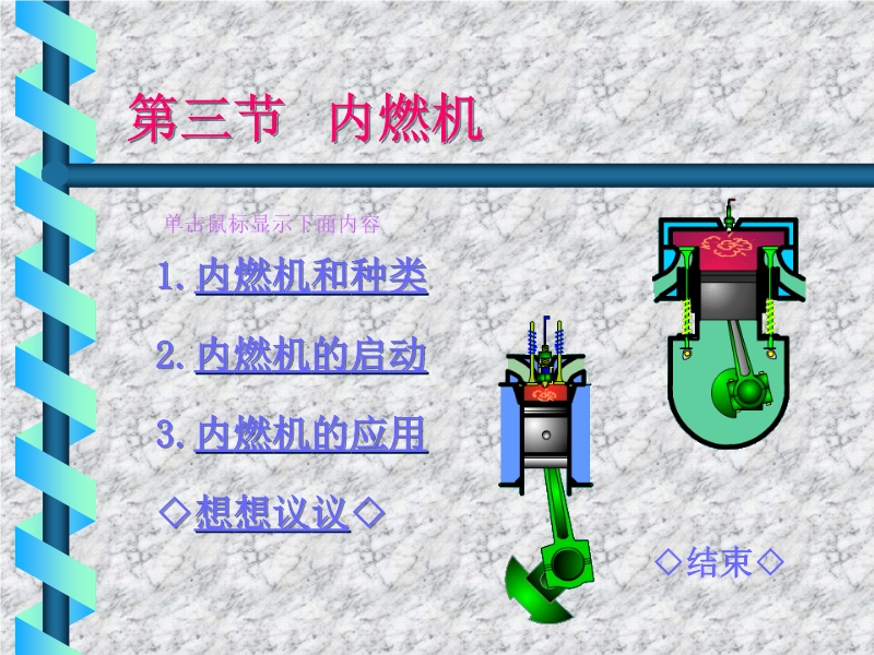 该课件为PPT软件制作的课件,课件展示的是"内燃机"这节课的完整上课内容,涉及内燃机和种类、启动、应用。具体的展示了汽油机和柴油机的工作过程、异同点,制作优美。可作讲授各种版本教材中“内燃机”课程使用。