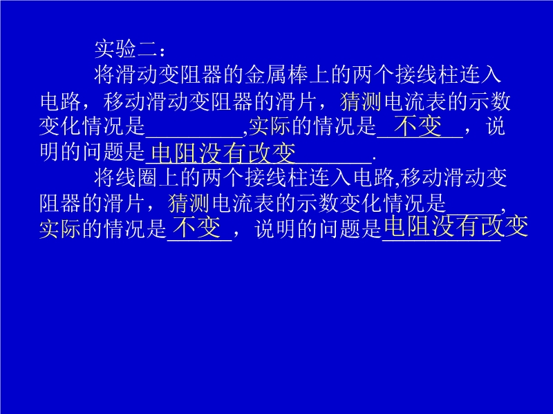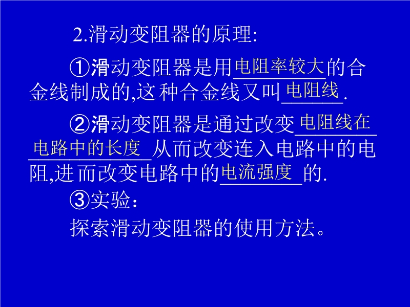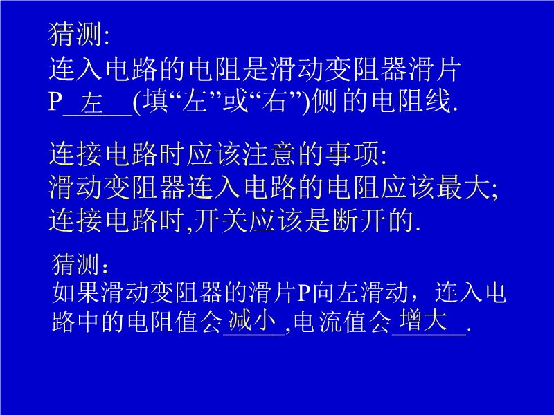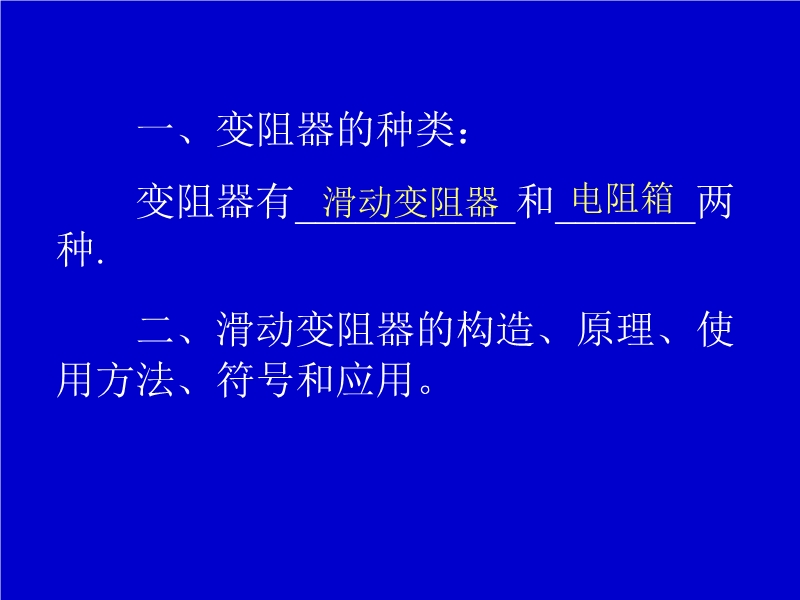 本课件是“变阻器”一节的完整教学课件,教学过程设计详细,环节完整。本课件向学生展示了两种变阻器:滑动变阻器和电阻箱,并引导学生思考两种变阻器的特点,以清晰的图片引导学生观察滑动变阻器的结构,认识其原理,引导学生通过实验去探究滑动变阻器的使用方法。可以帮助学生去认识、理解滑动变阻器的原理。课件中配以适当的练习,起到提高巩固的作用。
