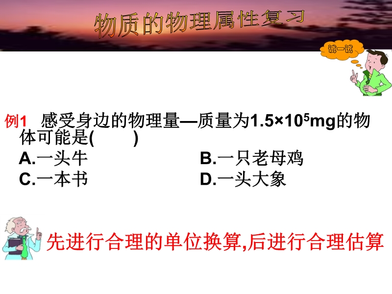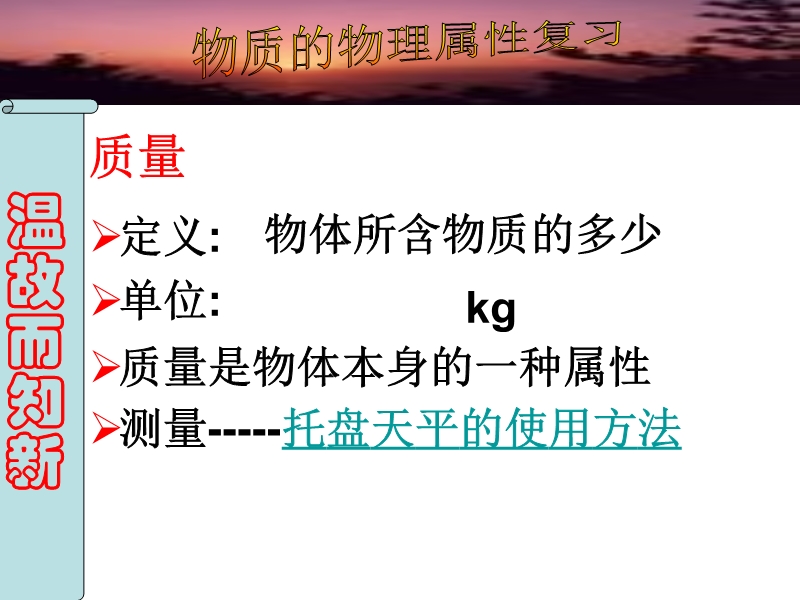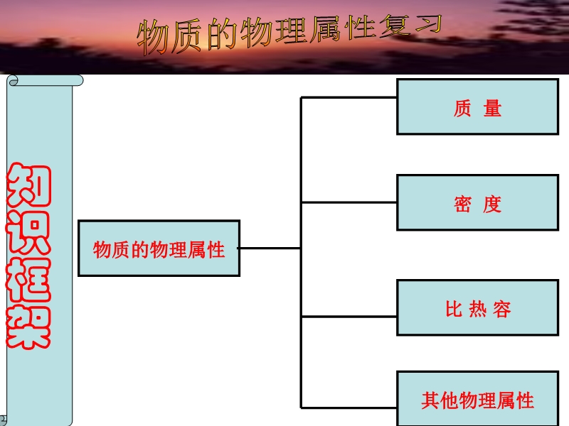 【内容简介】本课件引导学生综合复习了有关物质的物理属性的知识,内容主要包括质量、密度和比热容的知识等,共由20张幻灯片组成。课件内精选了大量有关的中考试题,具有典型性和创新性,可培养学生综合解决问题的能力。本课件可供中考综合复习时使用。