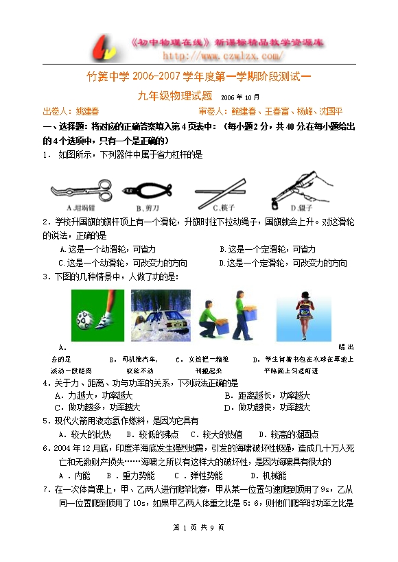 竹箦中学06-07第一学期九年级阶段测试题及解答