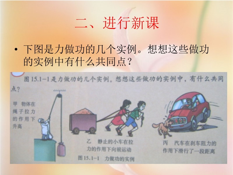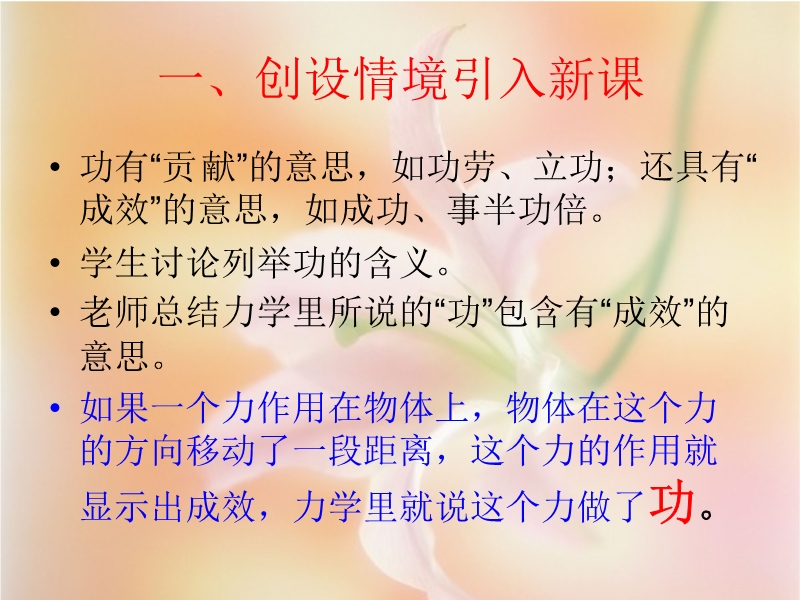 【内容简介】本课件引导学生认识了功的概念和功的计算方法、单位等,紧扣教材。教学过程设计新颖,主要以引导学生活动为主,让学生去自行解决问题,同时对于难点进行疏导。
