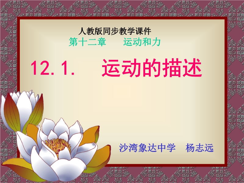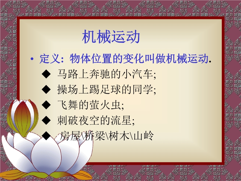 【内容简介】本课件以人教版新教材为基础制作,内容主要有机械运动的概念、参照物的选取、运动和静止的相对性等,共有12张幻灯片。教学过程以学生为主,充分体现了学生的主体性。课件还适当补充了练习题和例题,可供教学选用 。
